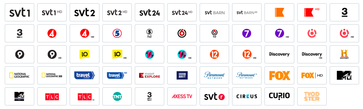 Föreningen har ett gruppavtal med Com Hem, kanalpaket Silver. För tilläggsavgiften om 285 kr per månad ingår då kanalerna nedan tillsammans med 100 Mbit/s bredband.